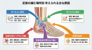 足首の痛みは痛む場所・痛み方・タイミングによって原因が大きく異なります。