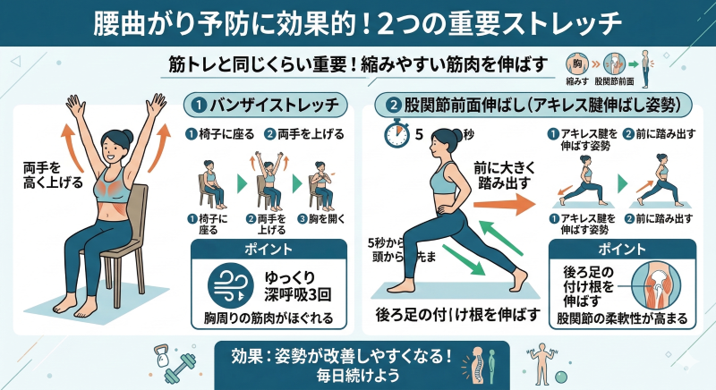 腰曲がりを予防するためには、背骨を支える背筋、体幹を安定させる腹筋、骨盤の角度を保つ腸腰筋をバランスよく鍛えることが重要です。