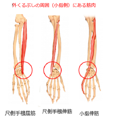 手首の外くるぶし部分には小指の働きに関係する筋肉がいくつかあります。