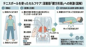 - 腰の外側(背骨から指3本分外)にテニスボールを当てます