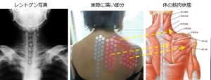 写真は「肩甲骨の付け根が痛い」という患者さんが、どこがどのように痛んでいるのか確認しながらパッチを貼って原因を調べた写真です。「菱形筋」や「棘下筋」と言った筋肉の痛んだ状態が分かります。