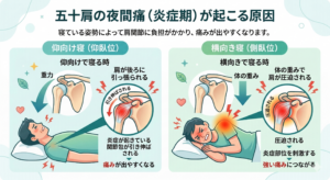五十肩の炎症期に多く見られる夜間痛は、寝る姿勢や肩への負担が大きく関係しています。
